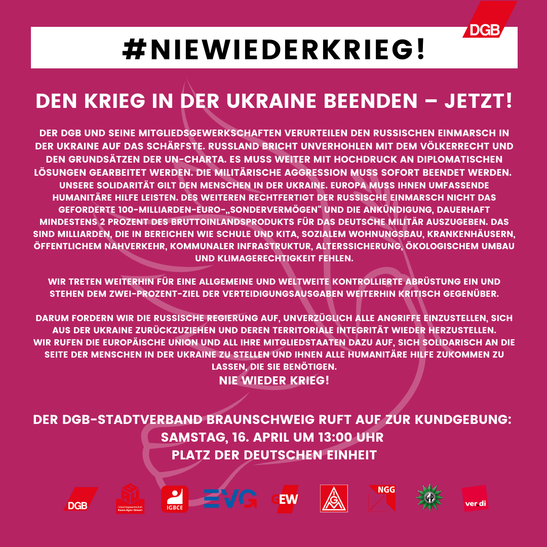 Kategorien Betriebsgruppe Aufruf zur Friedenskundgebung Post author Von hoeftn Post date 4. April 2022 Keine Kommentare zu Aufruf zur Friedenskundgebung am Samstag, 16. April 2022