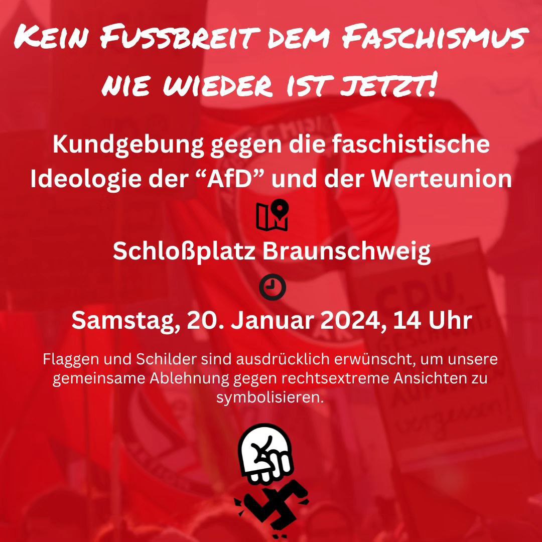 Am Samstag, den 20.01.2024, findet um 14:00 Uhr auf dem Schlossplatz vor der Bibliothek in Braunschweig eine Kundgebung gegen die rechtsextreme Ideologie und die Deportationspläne der „AfD“, Werteunion und weiterer rechter Akteure statt.